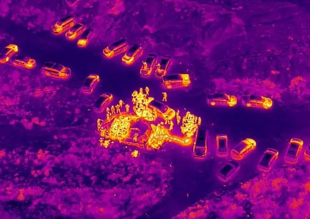 面对侦查和抓捕困境,办案人员扩展了侦查思路,在前期摸排中,利用经纬 M300 RTK无人机隐蔽性强、高机动性等优势,对该区域进行凌空侦查。借助无人机搭载的禅思 H20T多功能负载,开启高清红外模式,夜色下涉赌人员的分布及位置信息清晰可见。