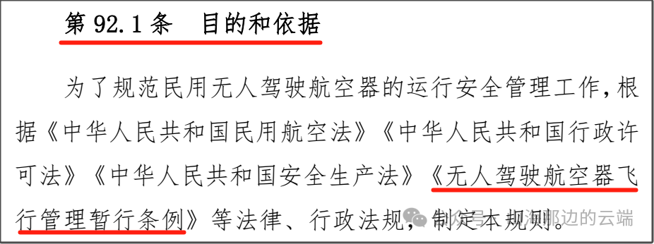 目前我国民用无人机驾驶航空器的管理主要是依从如下两个规定,分别是《无人驾驶航空器飞行管理暂行条例》(以下简称《条例》)和《民用无人驾驶航空器运行安全管理规则》(CCAR 92),其中《条例》是法规,《规则》是部门规章,《规则》的制定主要依据是《条例》,所以《规则》的上位法是《条例》。——有点绕口令!!!